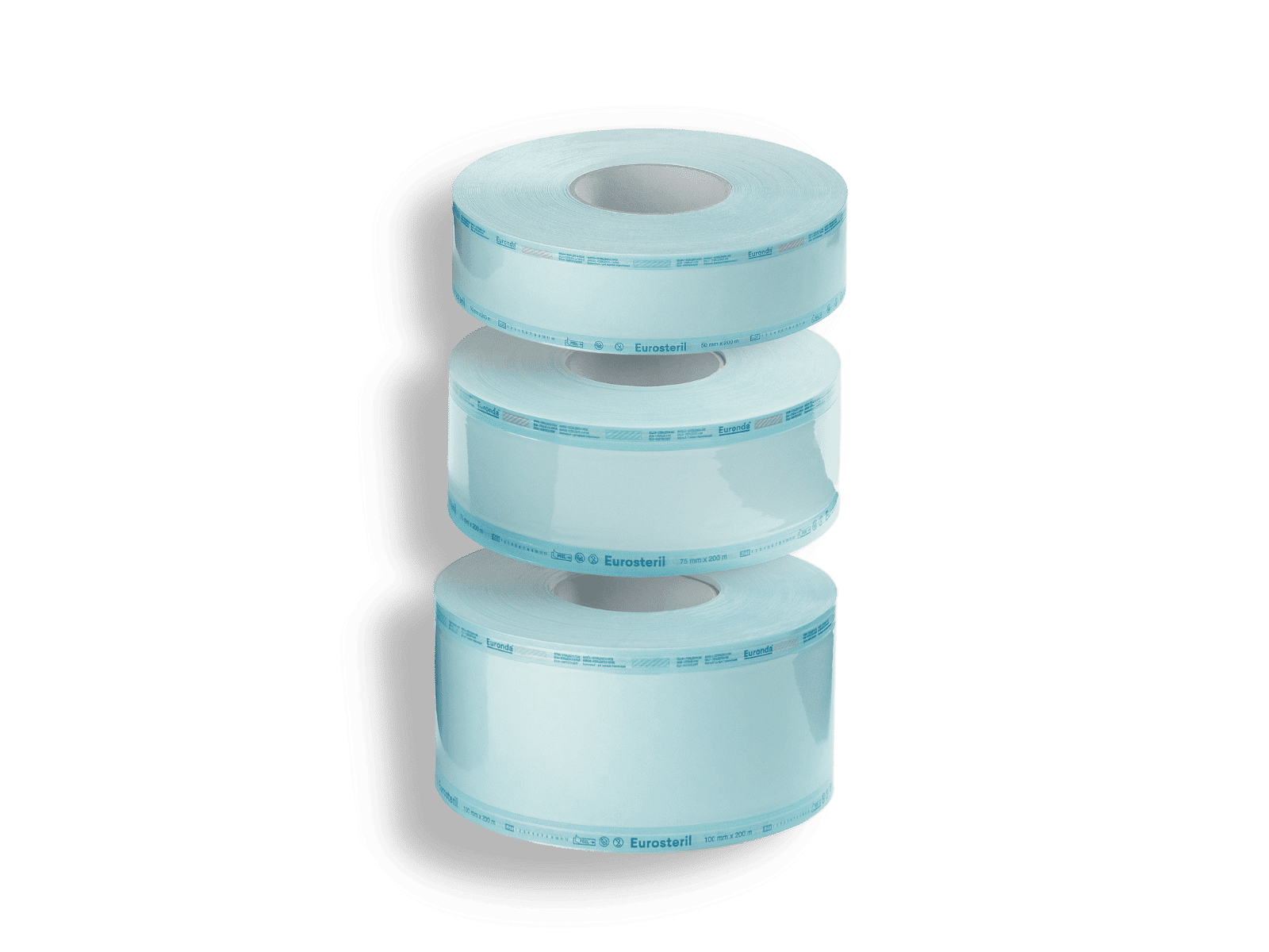 Eurosteril Sterilisationsfolie ist als Rollenware bis 30 cm Breite erhältlich in flacher Ausführung oder mit Falte für sperriges Material. Der Längenzuschnitt erfolgt individuell und einfach mithilfe der Markierungen am Folienrand. Zur Kontrolle ist ein Kontrastanzeiger integriert. Er zeigt an, ob eine Sterilisationsbehandlung mit Dampf stattgefunden hat.