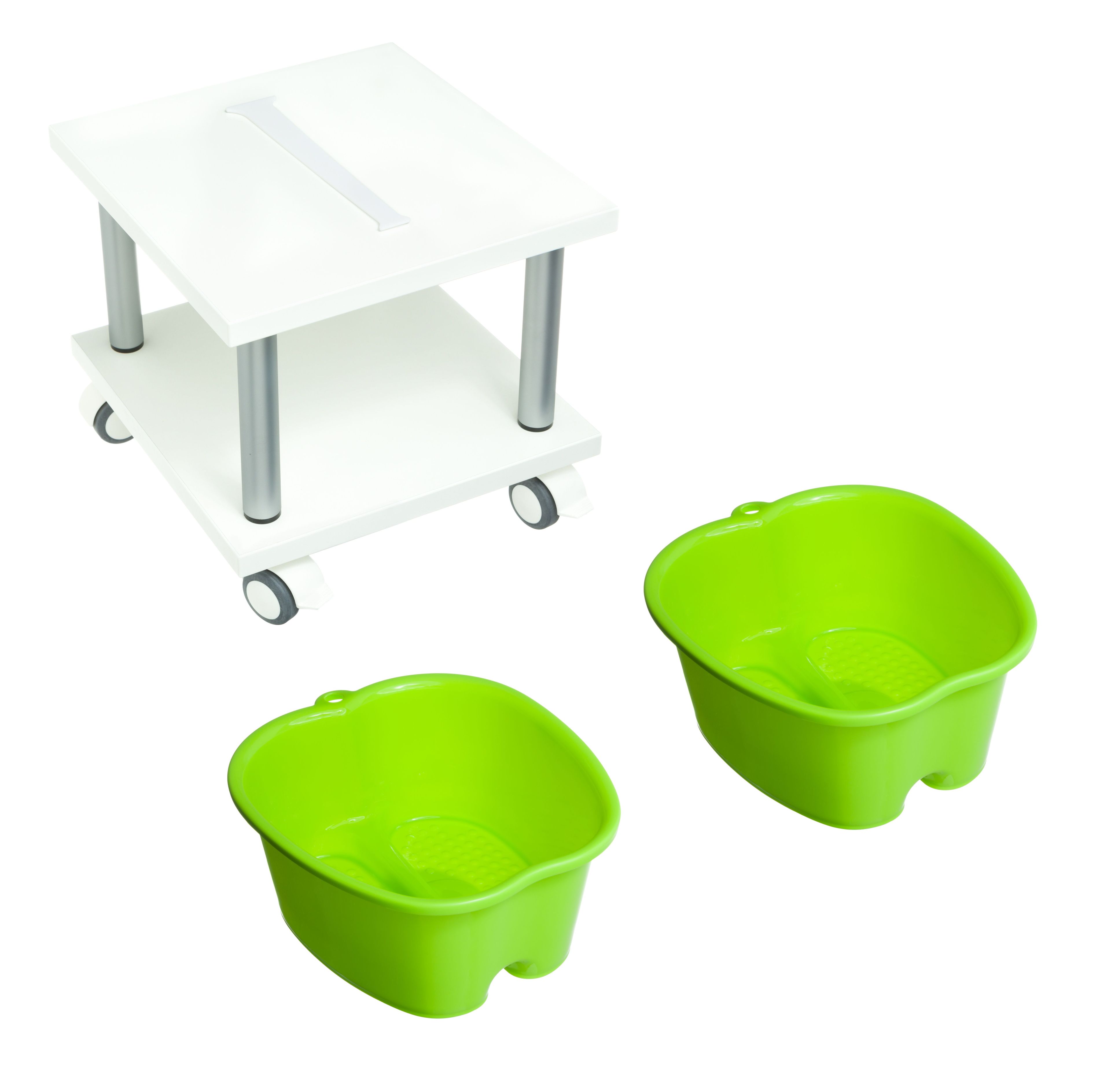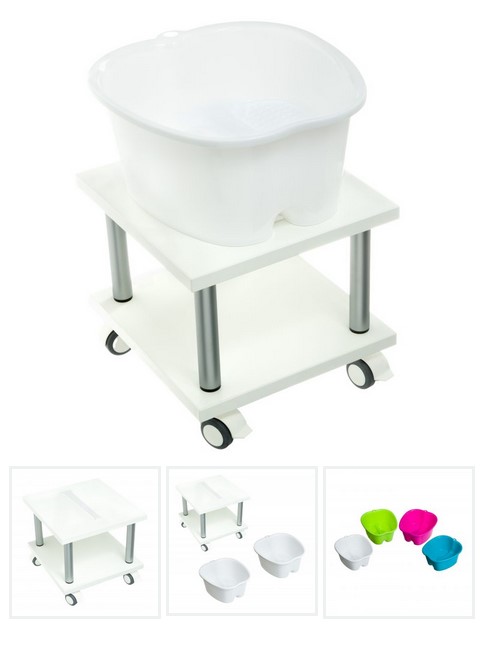Der Fußwannenwagen kann mit seinen Leichtlaufrollen einfach vom Einfüllort zum Kunden bewegt werden. Dabei geben die Feststeller an den Rollen einen sicheren Stand am Behandlungsplatz. Die hochwertige Beschichtung der Holzplattform ist wasserabweisend und desinfektionsmittelbeständig. Die Wannen können direkt mit Desinfektionsmittel behandelt oder alternativ mit Einweg-Hygienebeuteln (Art. 6753) überzogen werden. Der Wagen wird fertig montiert und mit 2 Wannen geliefert. Die Farben der Wannen können frei gewählt werden. Die Wannen halten durch eine Arretierung fest auf der Plattform.